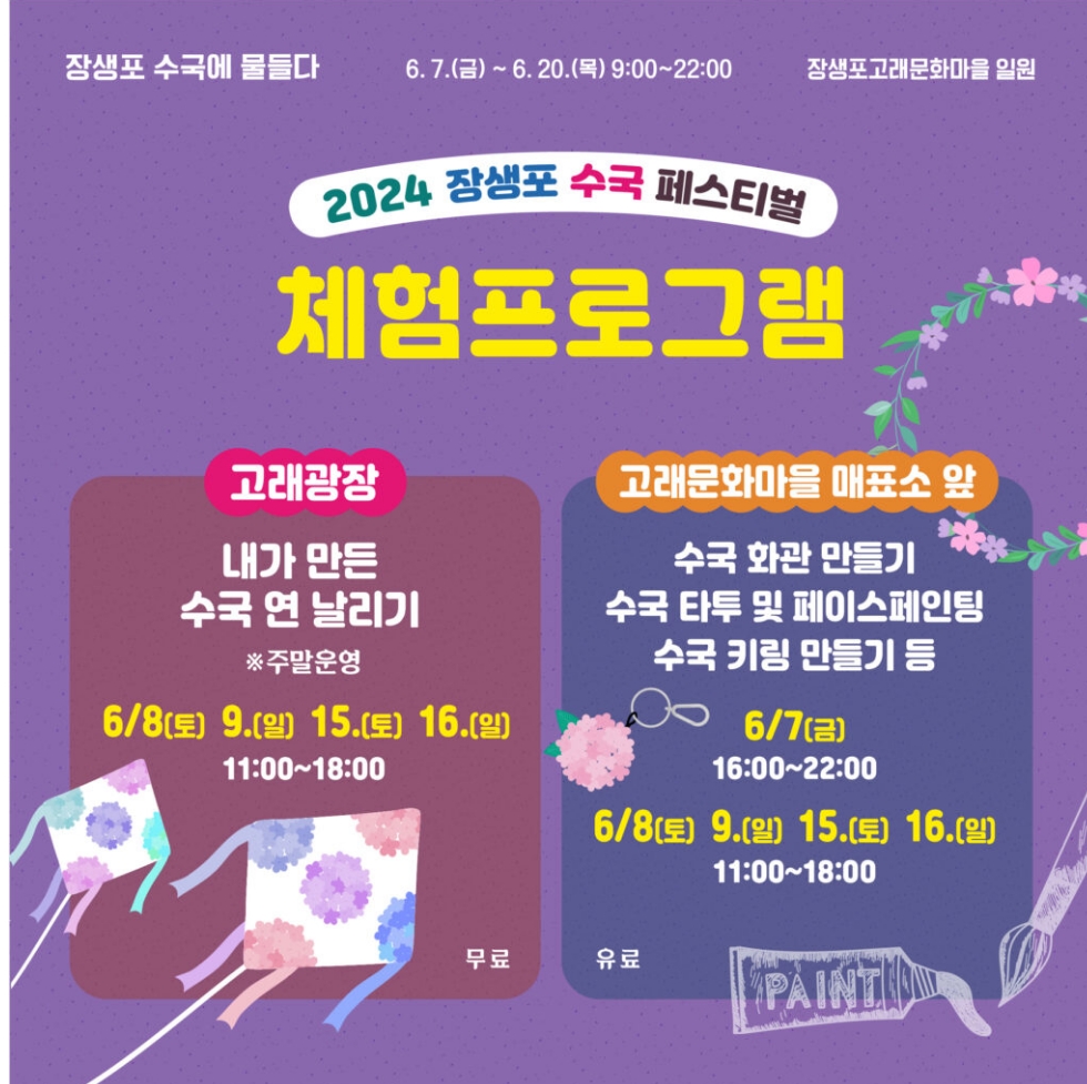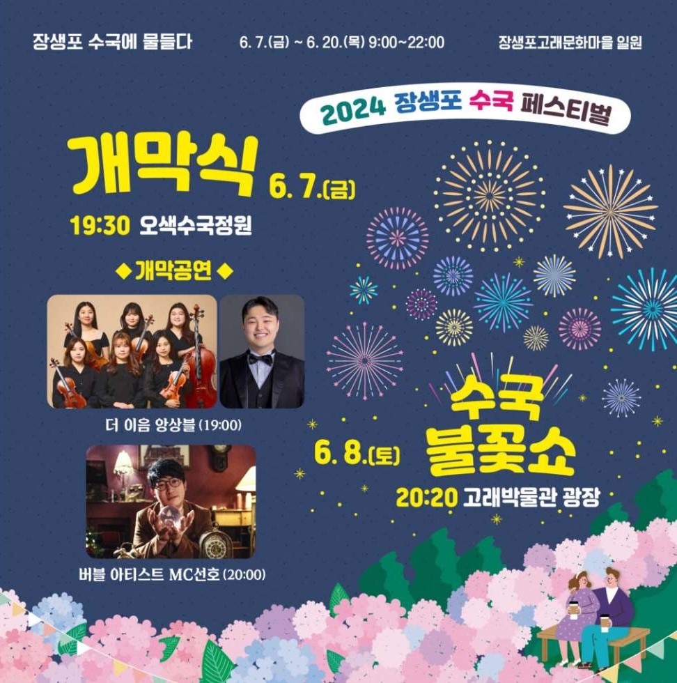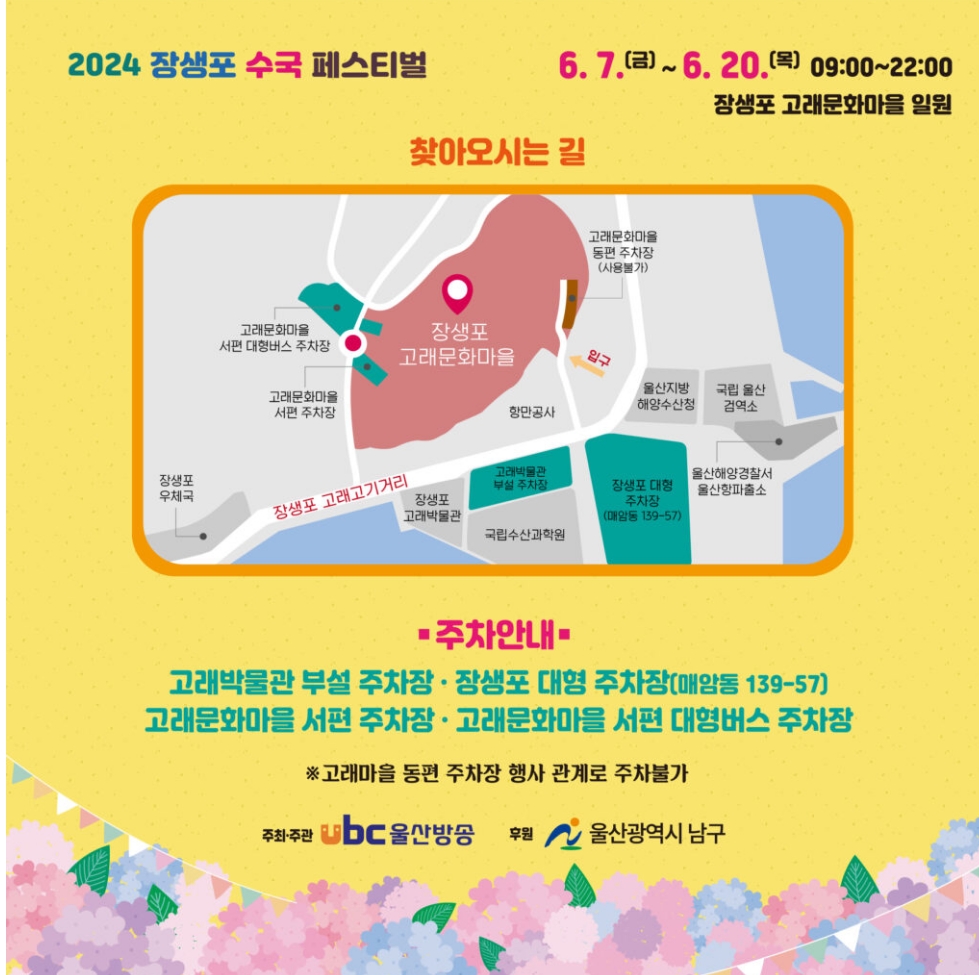 2024년 6월 7일부터 20일까지 2주간 울산 장생포 고래문화마을에서 '2024 장생포 수국 페스티벌'을 개최합니다. 이번 축제의 주제는 '장생포, 수국에 물들다'로 35개 품종 3만여 그루의 수국이 전시된다고 합니다. 공연, 체험 프로그램, 수국 마켓 등 풍성한 볼거리와 즐길 거리가 다양하게 준비되어 있습니다.